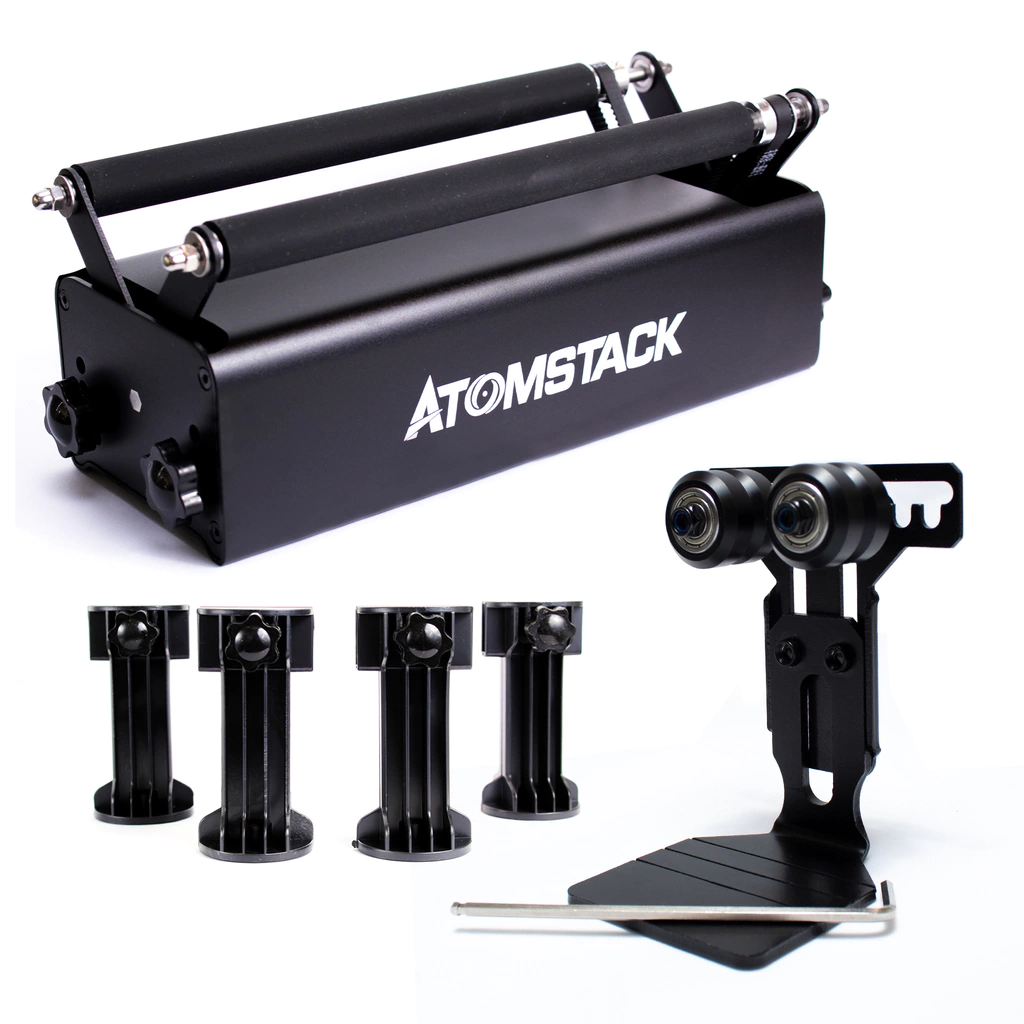 -Compatible con todos los modelos de Atomstack, Pero en el caso de las portátiles (con un área de trabajo de 20x20 cm) al usarlo para grabar artículos con gran circunferencia haya que agregarle más altura, pero para grabado de cosas pequeñas como lápices, biromes, etc no es necesario.
